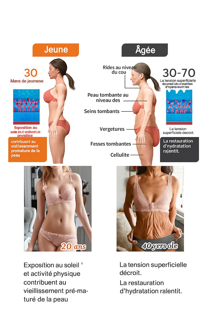Avec l'âge, le corps subit les effets naturels du vieillissement. Ce processus débute généralement au début de la vingtaine, lorsque la production de collagène , qui contribue à la structure de la peau, commence à ralentir et que l' élasticité de l'élastine , responsable de la résilience cutanée, diminue ou se détériore. Ces effets sont particulièrement visibles chez les femmes.