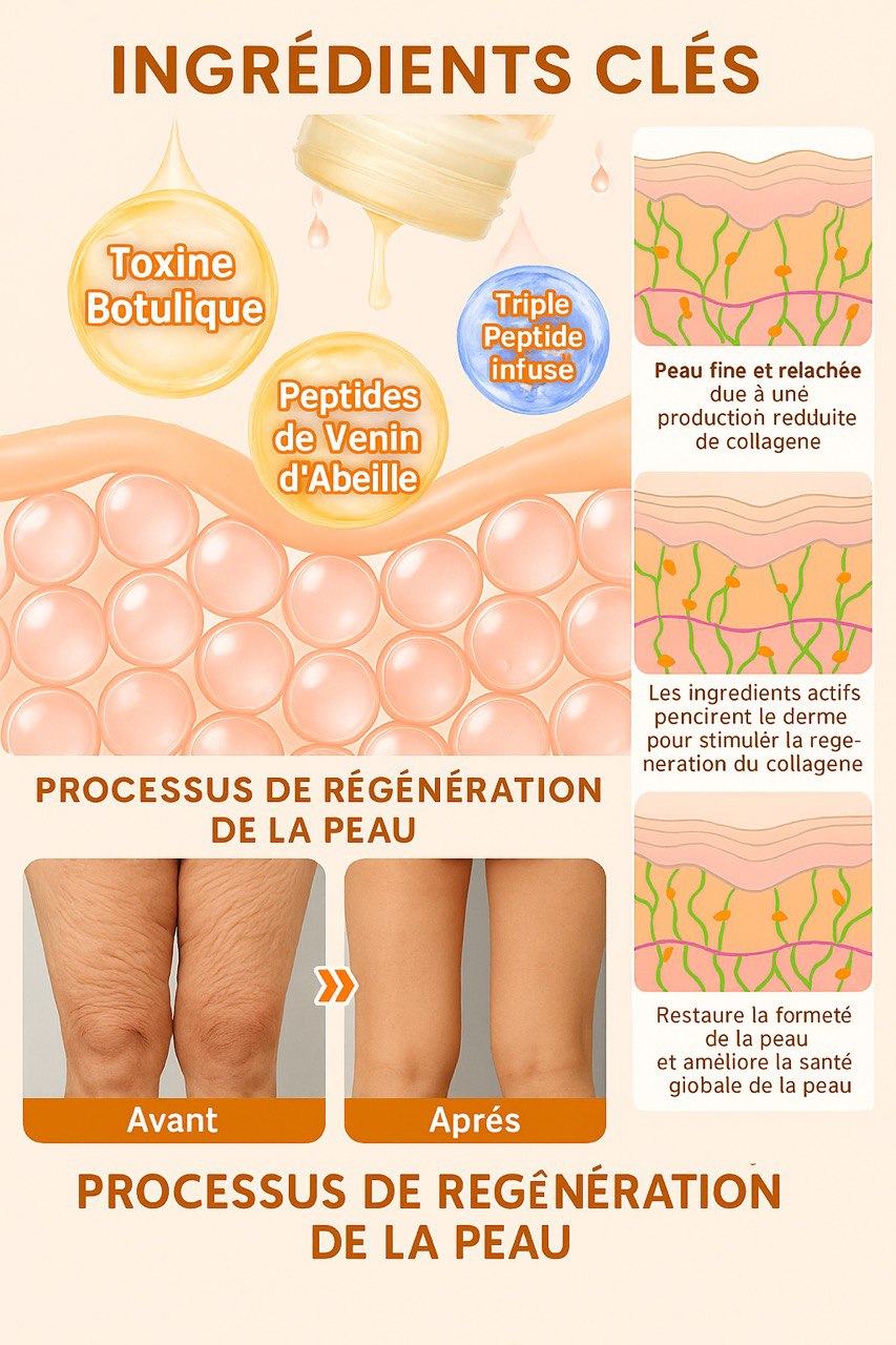 Découvrez les bienfaits du Sérum Raffermissant Botox au Venin d'Abeille TLOPA® : il améliore le teint, booste l'élasticité et réduit la cellulite. Les ingrédients naturels soigneusement sélectionnés de cette formule contribuent à régénérer les cellules cutanées, à hydrater et à améliorer l'élasticité tout en favorisant une meilleure circulation. Grâce à sa texture légère, la crème pénètre facilement dans la peau, atteignant les couches profondes pour apporter les nutriments essentiels qui contribuent à une peau d'apparence plus jeune et plus ferme.